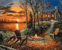 Malowanie Po Numerach Dom Z Ogniskiem Przy Zachodzie Słońca 40x50 Na Ramie