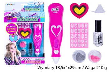 ZESTAW DO PAZNOKCI 2 BROKARY + APLIKATOR KARTON pak 72/36 Wymiary 18,5x4x29 cm / Waga 210 g wsyp brakat do aplikatora, pomaluj paznokce lakierem, na mokry lakier posyp brokarem baterie R3X2-brak w zestawie