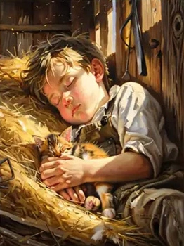 Diamentowa Mozaika Chłopiec Z Kotkiem Na Sianie 30x40 Cm Kreatywne Diamenty