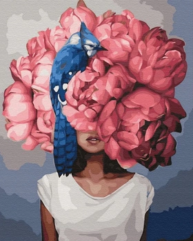 Diamentowa Mozaika Kobieta Z Głową Z Kwiatów I Niebieskim Ptakiem 30x40 Cm