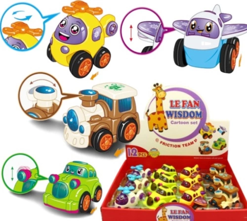 AUTKA DLA DZIECI Z RUCHOMYMI ELEMENTAMI, pak 288 pojazdy napędzane, ruszające się elementy, cztery różne wzory, display 12 sztuk wymiar display 37 x 27,5 x 7,3 cm przybliżony wymiar pojazdu: 8,5 x 6 x 8 cm