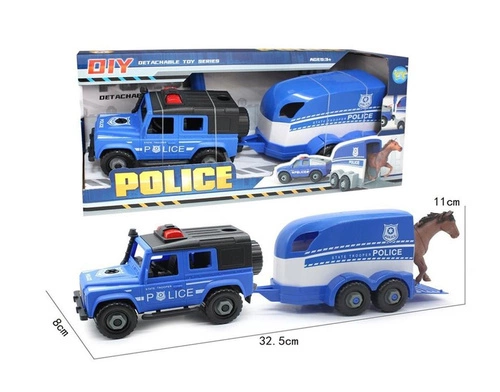 AUTO JEEP POLICJA Z PRZYCZEPĄ ZABUDOWANĄ + KOŃ KARTON OTWARTY PAK 48/24 śrubokręt w zestawie , odkręcane koła i przyczepa, twierany dach przyczepy