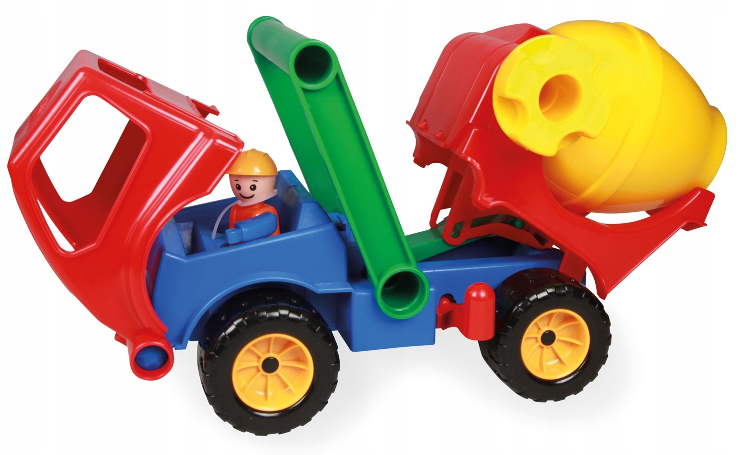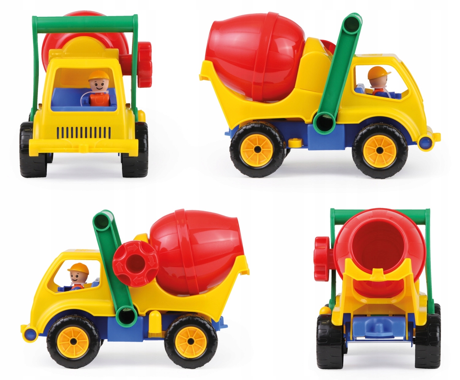 Jeździ na kołach, które można poruszać, pchając je rączkami dziecka. Bęben betoniarki można obracać i przechylić, aby np. wysypać piasek. Obrót bębna jest możliwy dzięki bocznemu pokrętłu. Blokada na podwoziu umożliwia łatwe zwolnienie ładunku, który można unieść i wyjąć. Kabina kierowcy otwiera się uchylnie, a w środku siedzi mały kierowca, który może być wyjęty i bawić się nim osobno.
