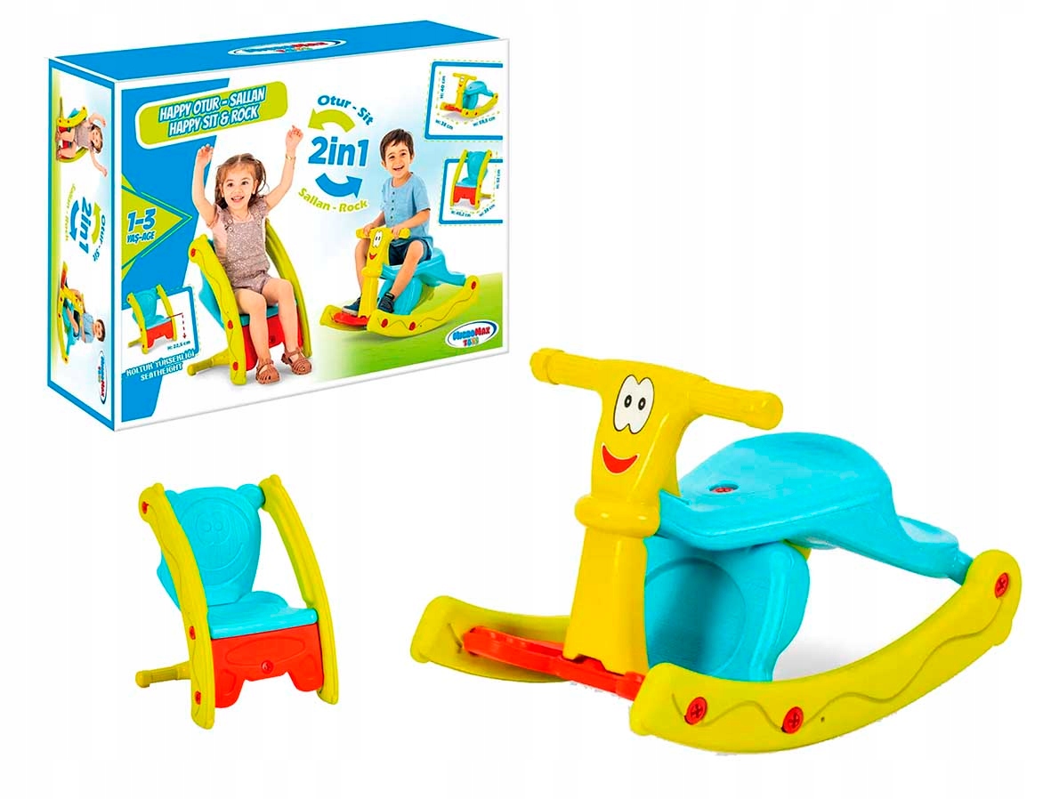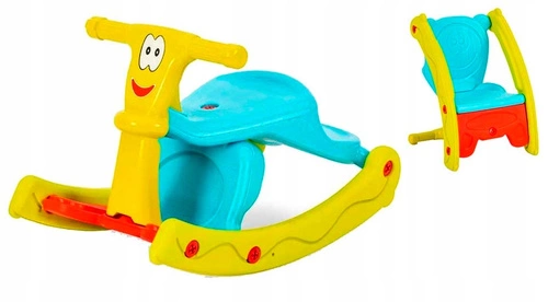 Funkcjonalna zabawka o dwóch zastosowaniach, którą można złożyć w formie klasycznego bujaka lub wygodnego krzesełka.