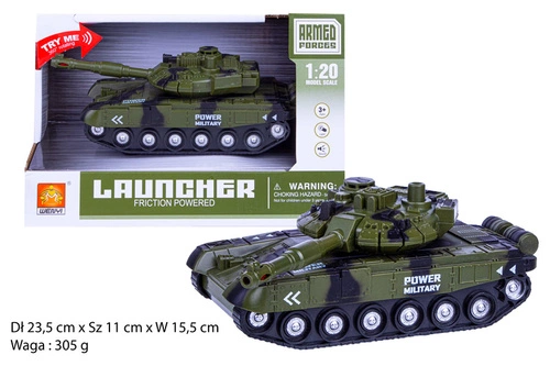 CZOŁG LAUNGER ŚWIATŁO , DZWIĘK B/O KARTON OTWARTY pak 48 1:20 wym. 23,5x10,7x15,5 Dł 23,5 cm x Sz 11 cm x W 15,5 cm Waga : 305 g świecąca lufa, dżwięk strzelania uruchomiany przyciska na dachu baterie AG13X3 w zestawie