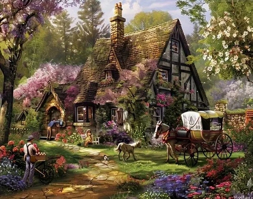 Diamentowa Mozaika Haft Diamentowy Bryczka Na Tle Ogrodu I Domu 30x40