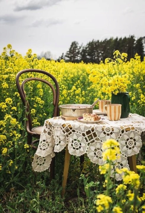 Diamentowa Mozaika Haft Kawa Przy Stoliku W Kwitnącym Rzepaku 30x40 Cm