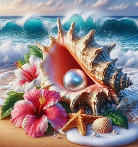 Diamentowa Mozaika Haft Kreatywny Muszla Perła Kwiaty Na Wybrzeżu 30x40 Cm