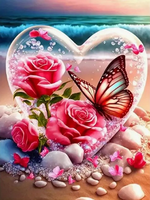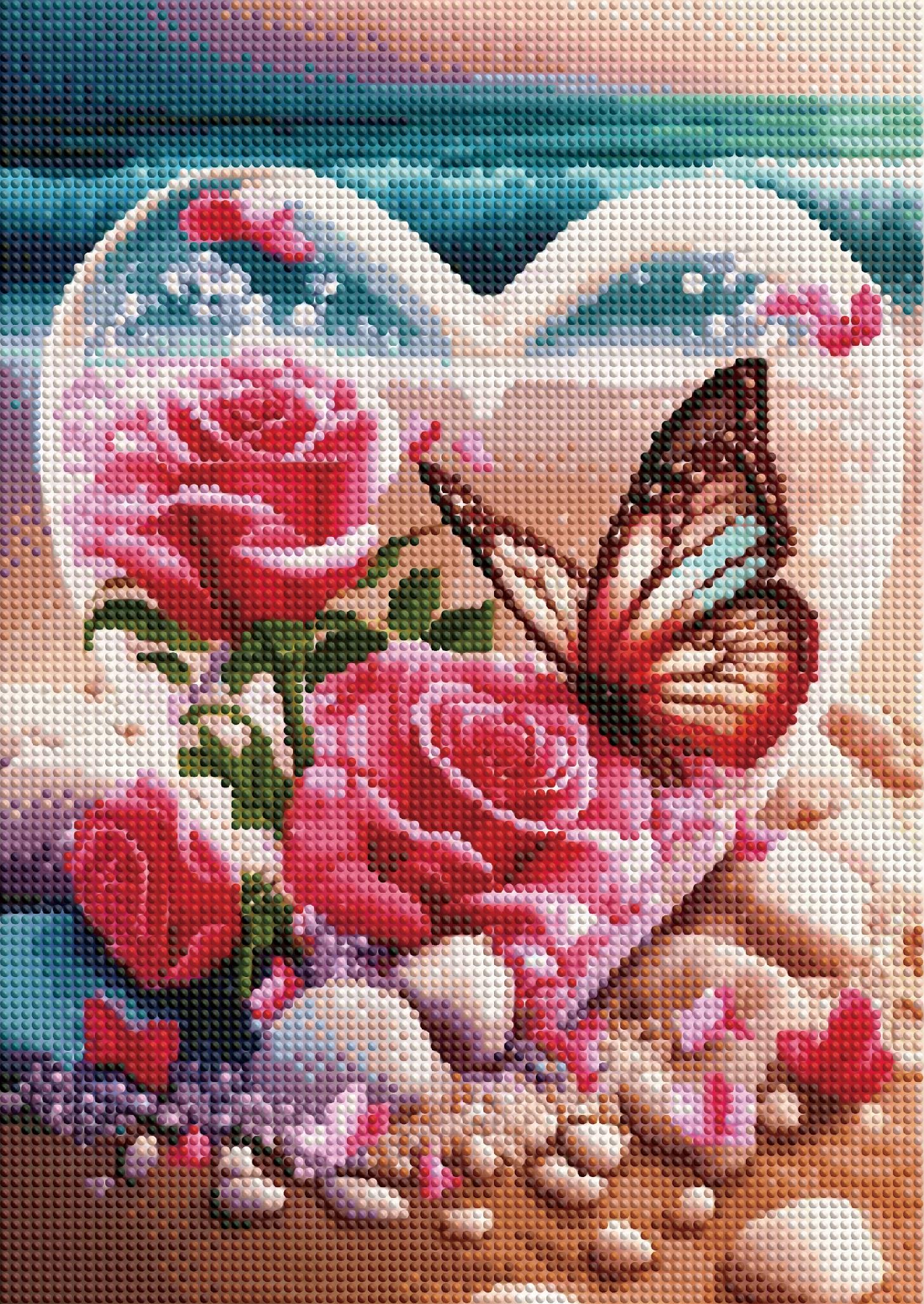 Diamentowa Mozaika Haft Szklane Serce Z Różami I Motylem Na Plaży 30x40 Cm