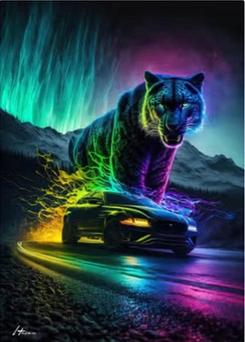 Diamentowa Mozaika Haft Tygrys I Auto Na Tle Zorzy 30x40cm