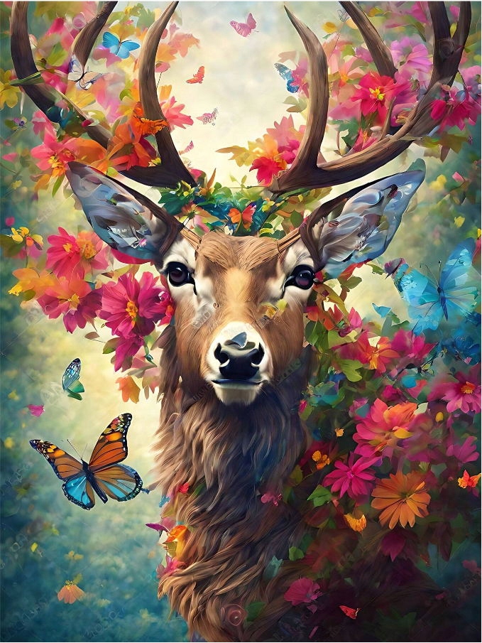 Diamentowa Mozaika Jeleń w Kwiatach Z Motylami 30x40Cm Kreatywne Diamenty