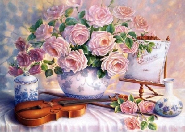 Diamentowa Mozaika Kwiaty Skrzypce Haft Kreatywny 30x40 Cm