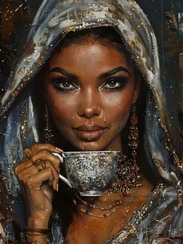 Diamentowa Mozaika Portret Kobiety Z Filiżanką 30x40Cm Kreatywne Diamenty