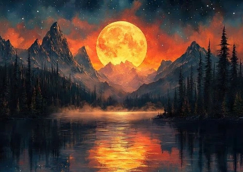 Diamentowa Mozaika Złoty Księżyc Na Tle Gór 30x40 Cm Kreatywne Diamenty