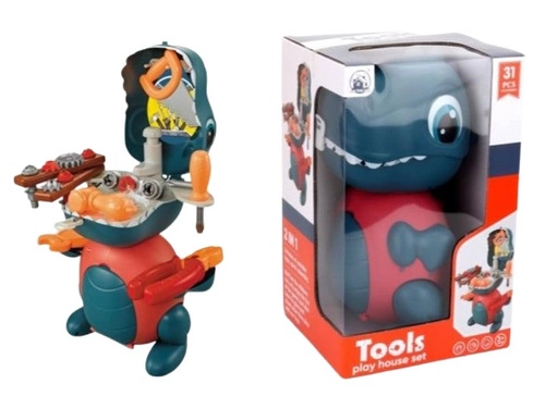 DINOZAUR ROZKŁADANY Z ZESTAWEM NARZĘDZI, pak 36/18 duży dinozaur-pojemnik z otwieraną paszczą tworzącą warsztat. Skrytka w brzuchu dinozaura na narzędzia. wymiary dinozaura-pojemnika: 37,3 x 22,9 x 27,5 cm wymiary pudełka: 17,5 x 19 x 30 cm