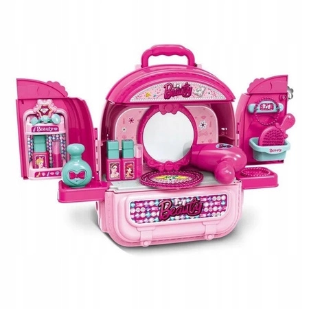 Zestaw zawiera wygodny plecak z regulowanymi paskami, kompaktowy domek dla lalek z salonem, tarasem, łazienką i lalką oraz toaletkę do makijażu, idealną dla małych stylistek.