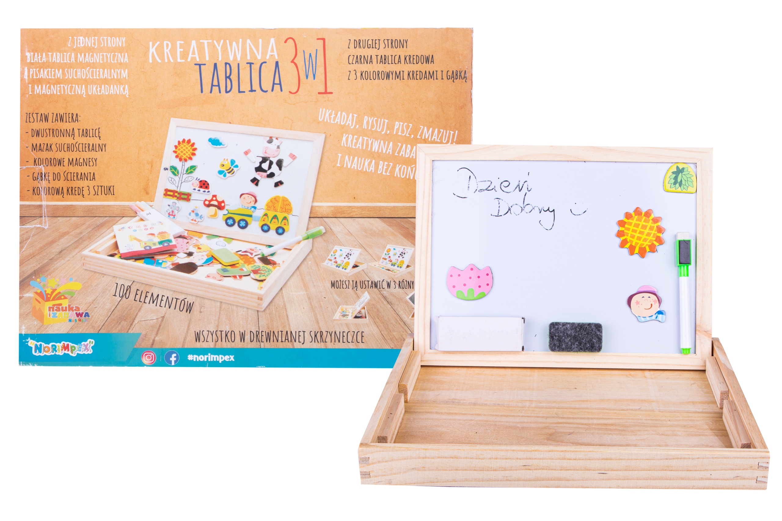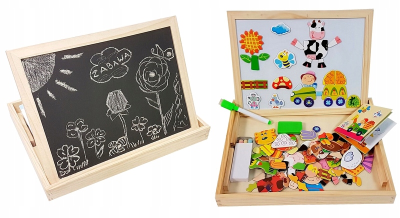 Drewniana układanka farma z tablicą magnetyczną to kreatywna i wielofunkcyjna zabawka, która zapewnia dziecku wiele możliwości twórczej zabawy. Po jednej stronie skrzynki znajduje się powierzchnia magnetyczna, do której można przyczepiać kolorowe elementy przedstawiające zwierzęta, rośliny czy inne wiejskie scenki, co pobudza wyobraźnię i wspiera naukę opowiadania historii. Druga strona służy jako klasyczna tablica, po której dziecko może pisać kredą lub rysować, rozwijając swoje zdolności manualne i plastyczne.