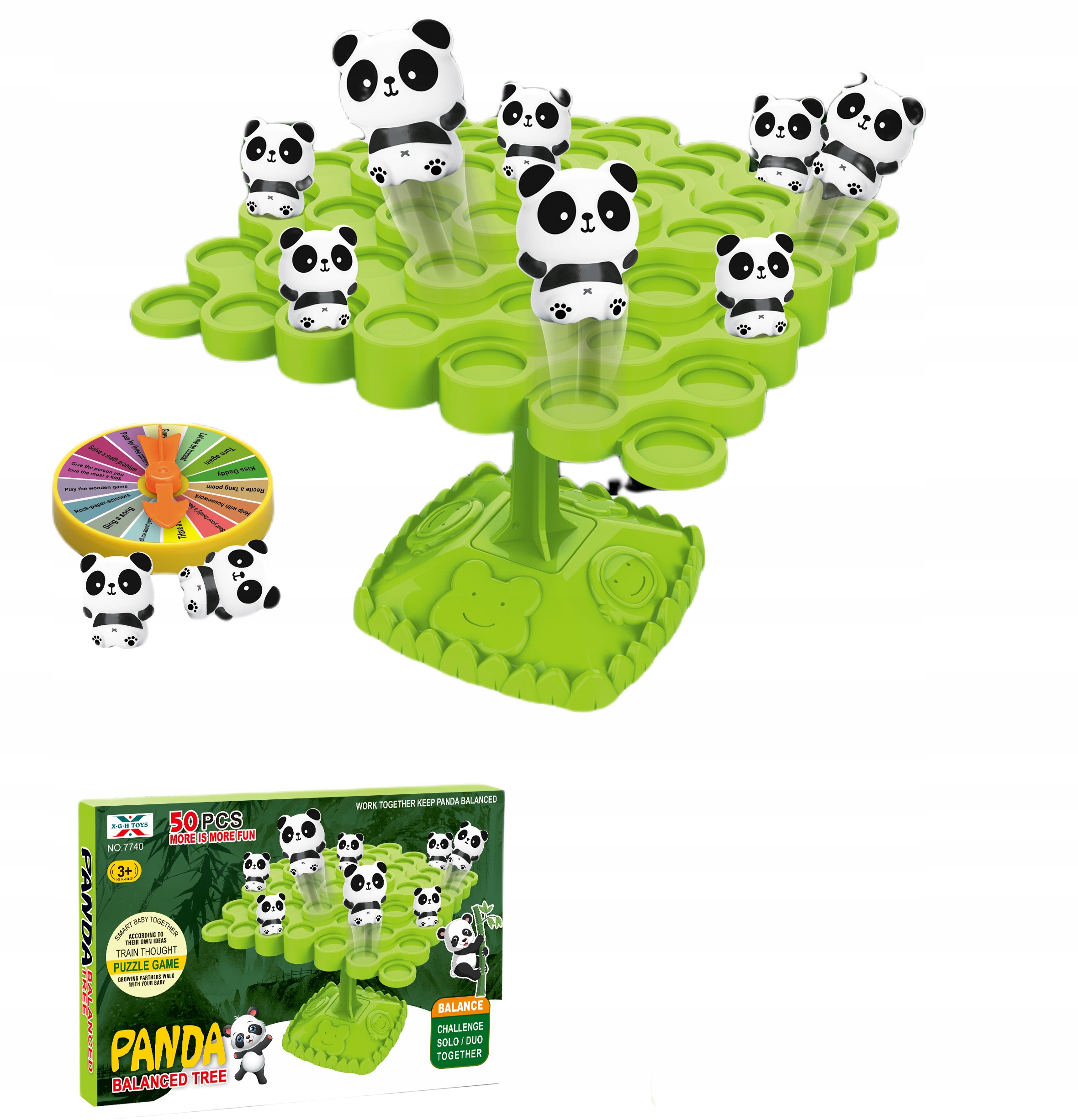 Zawartość zestawu: figurki pand, tarcza do losowania, woreczek, składane drzewko z platformą