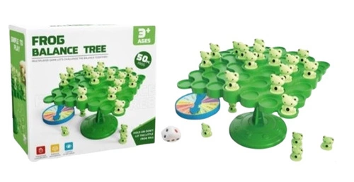 GRA BALANSUJĄCE ŻABKI, pak 120, wiek: 3+, w pudełku: figurki żabek, kostka, tarcza do losowania, wymiary pudeła: 14x 7 x 14 cm