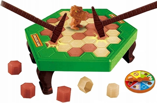 Spróbuj uratować dinozaura przed jego upadkiem w tej ekscytującej grze! Zasady są wyjątkowo proste: najpierw losujemy kolor kamienia do zbicia za pomocą obracającej się tarczy. Następnie gracze używają dołączonych do gry młotków, aby wybić kamienie w wylosowanym kolorze. Jest tylko jeden haczyk – jeden z kamieni nosi na sobie dinozaura i może spaść w dowolnym momencie! Jeśli uda ci się ocalić dinozaura, zostajesz zwycięzcą. Ale uwaga, jeśli dinozaur spadnie podczas twojej kolejki, przegrywasz.