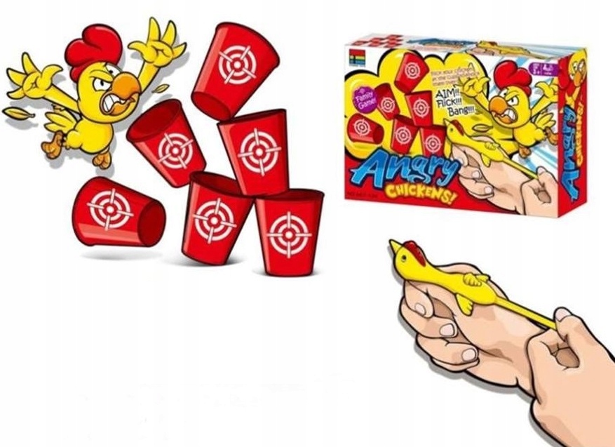 Gumowe kurczaki pełnią funkcję elastycznych procy, co dodaje całej grze humorystycznego charakteru i wzbudza salwy śmiechu podczas celowania w wieże z kubeczków. Wciągająca mechanika rozgrywki sprawia, że każda runda jest inna i pełna niespodzianek.
