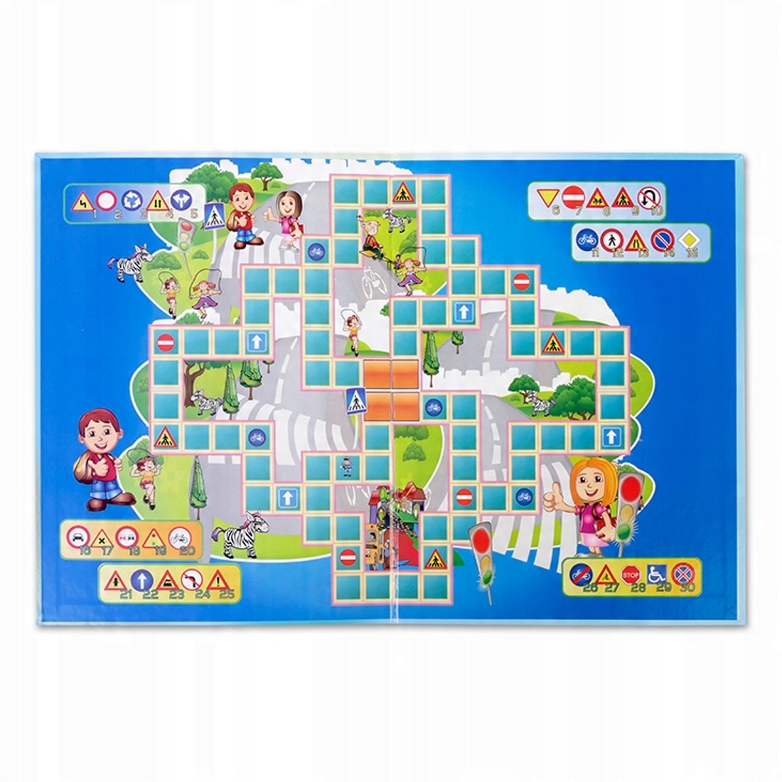 Plansza gry została zaprojektowana w sposób atrakcyjny wizualnie i jednocześnie logiczny, co ułatwia dziecku zrozumienie podstawowych reguł ruchu drogowego. Dzieci podczas rozgrywki uczą się rozpoznawać znaki drogowe, sygnalizację świetlną oraz zasady bezpiecznego przechodzenia przez jezdnię. Taka forma nauki sprzyja utrwalaniu prawidłowych nawyków w sposób naturalny i angażujący.