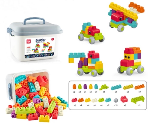 KLOCKI KONSTRUKCYJNE MIĘKKIE BUILDER SOFT BLOCK 62 ELEMENTY, pak 12 sensoryczne klocki dla młodszych. Opakowanie: skrzynka. wymiary: 23 x 27 x 35 cm