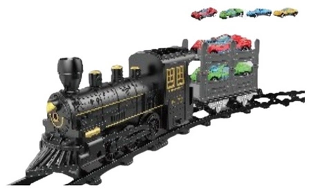 KOLEJKA LOKOMOTYWA Z WAGONEM-LAWETĄ + 2 AUTKA, pak 36, elektryczna kolejka, światło, dźwięk, różne kolory samochodzików (z czterech możliwych), wymiary opakowania: 38,5 x 8 x 22 cm