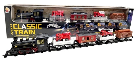 KOLEJKA TRANSPORTOWA LOKOMOTYWA + 4 WAGONY + 2 AUTKA, pak 16 pociąg do transportu, wagon z drewnem, dwa wagony do przewozu aut + dwa autka. 12 elementów, światło/dźwięk/para, wymaga baterii, wymiary rozłożonego toru: 140 x 92 cm, wymiary opakowania: 83