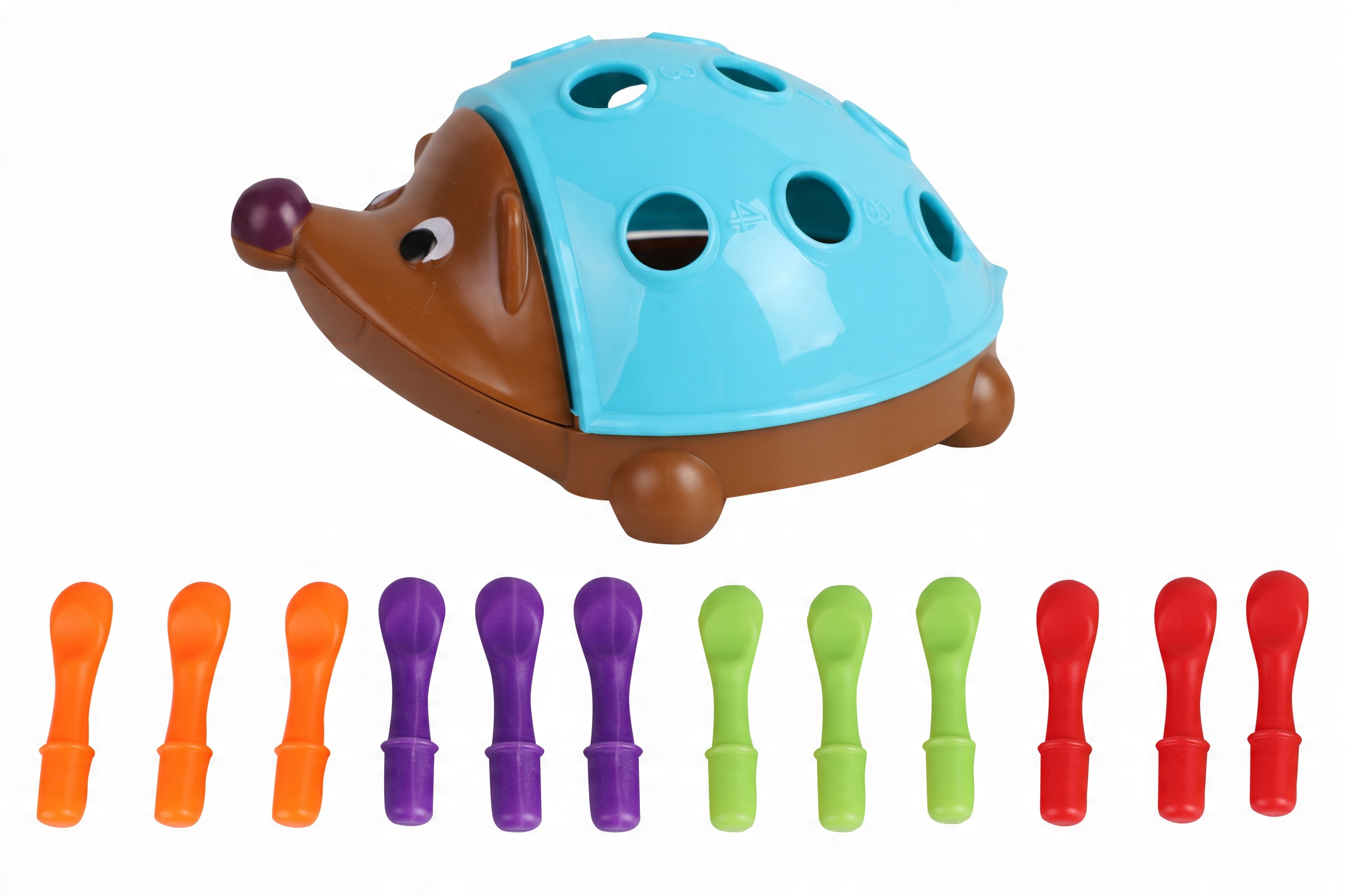 W zestawie znajduje się 12 kolorowych patyczków, które dziecko może umieszczać w odpowiednich otworach na grzbiecie jeża – każdy z nich oznaczony jest cyfrą, co stanowi doskonałą okazję do nauki liczenia i rozróżniania barw. Zabawa polega na dopasowywaniu elementów do właściwych miejsc, co ćwiczy spostrzegawczość, koncentrację i precyzję ruchów.
