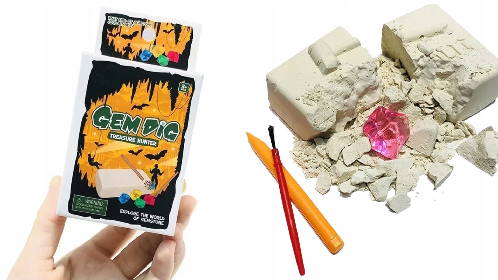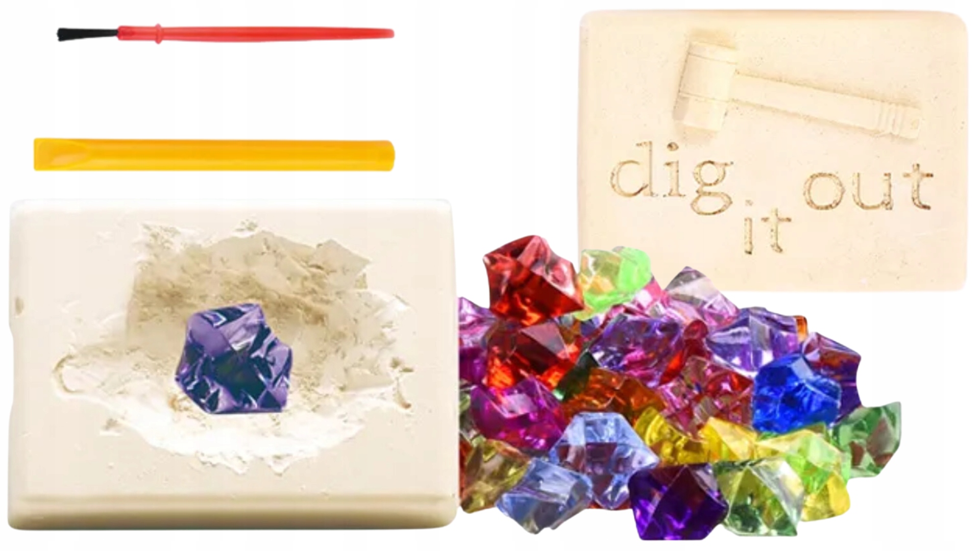 Zawartość zestawu: bloczek ze skarbem, narzędzia do odkopywania