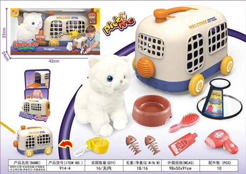 w zestawie : pluszowy kotek piszczący manualnie, plastikowy transporter na kółkach, miska, suszarka, szczotka, tubka z maścią (mechaniczną), kołnierz weterynaryj