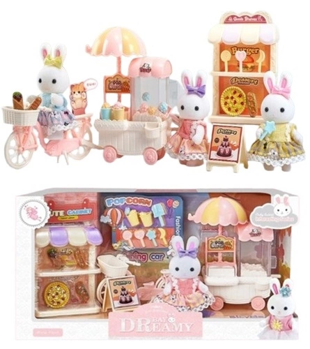 przesłodki zestaw zawiera: 1 x króliczek (do zebrania różne wzory strojów), wózek ze słodyczami (popcorn, lizaki, łopatka), rowerek, uliczny straganik z przekąskami i potykacz.