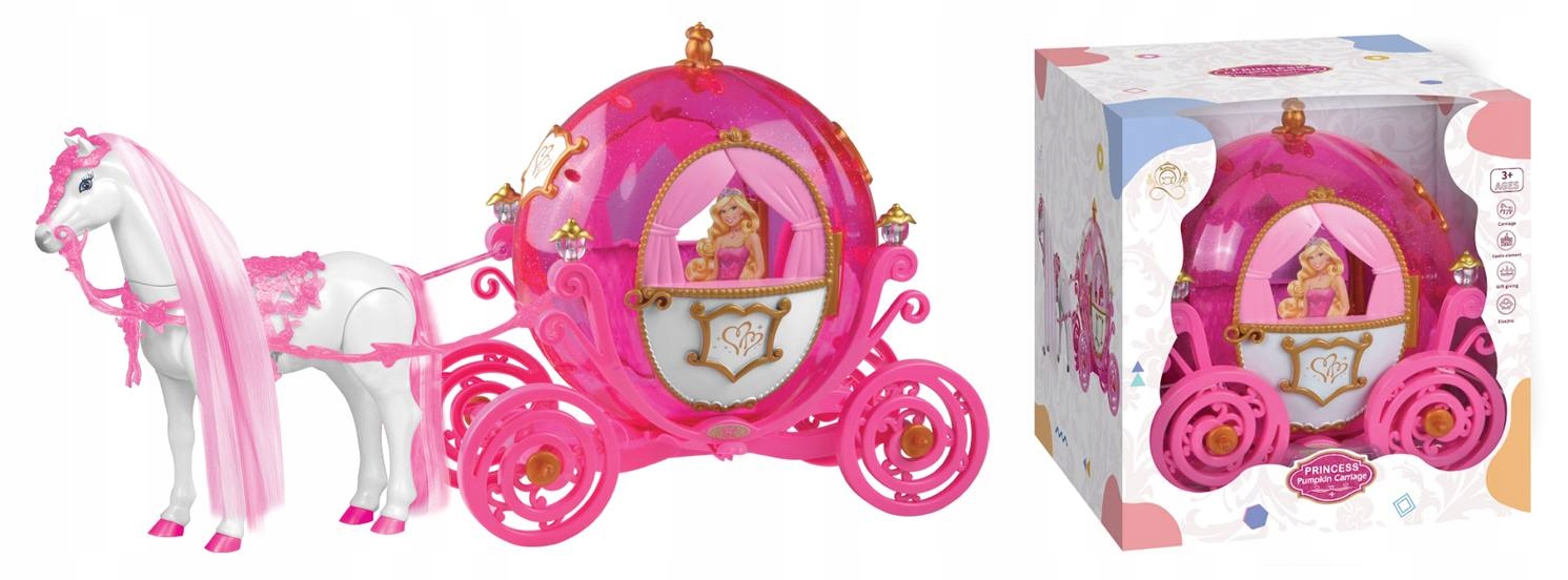 Zawartość zestawu: kareta dynia, elektryczny koń chodzący z dźwiękami