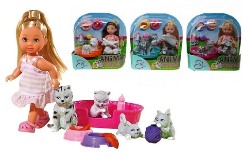 - Evi zajmuje się swoimi czworonogami. W zestawie znajdziemy lalkę Evi, cztery zwierzaki, leżankę, miski na pokarm, butelki na mleko i zabawki. Produkt przeznaczony dla dzieci od 3 lat.