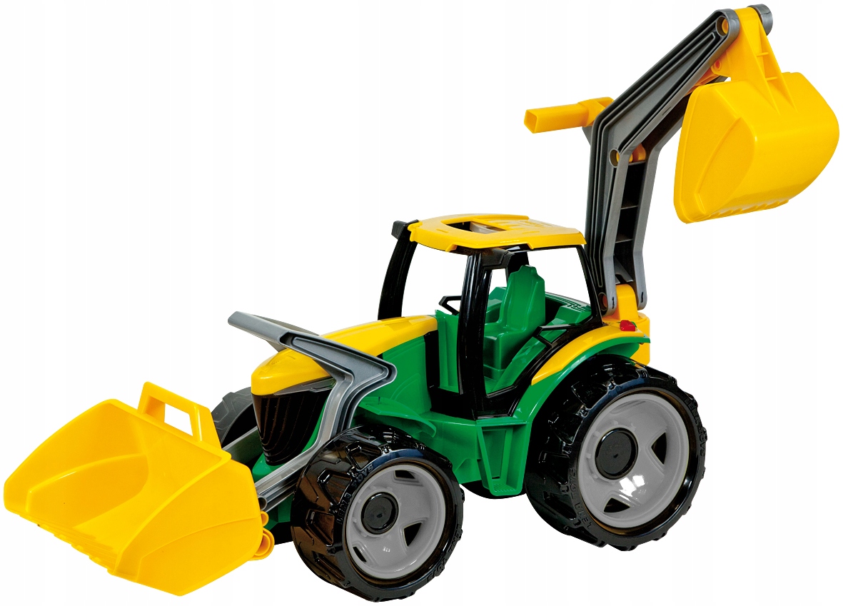 Dodatkowo, ten traktor jest wyposażony w ruchomy spych z przodu oraz ruchomą łychę z tyłu, co pozwala na różnorodne zabawy i twórcze projekty. Jest przeznaczony do manualnego sterowania, co zachęca do interakcji i rozwija zdolności motoryczne u dzieci.