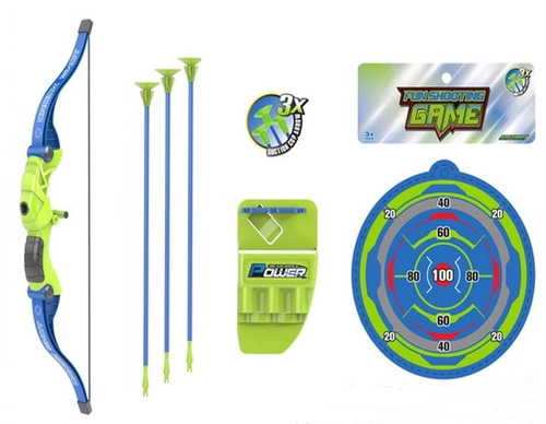 ŁUK Z TARCZĄ ZIELONO-NIEBIESKI, pak 72 wymiary tarczy: 18 cm wymiary łuku: 57 cm wymiary strzał: 43,5 cm wymiary kołczanu: 15,5 cm wymiary opakowania: 58 x 4 x 20 cm