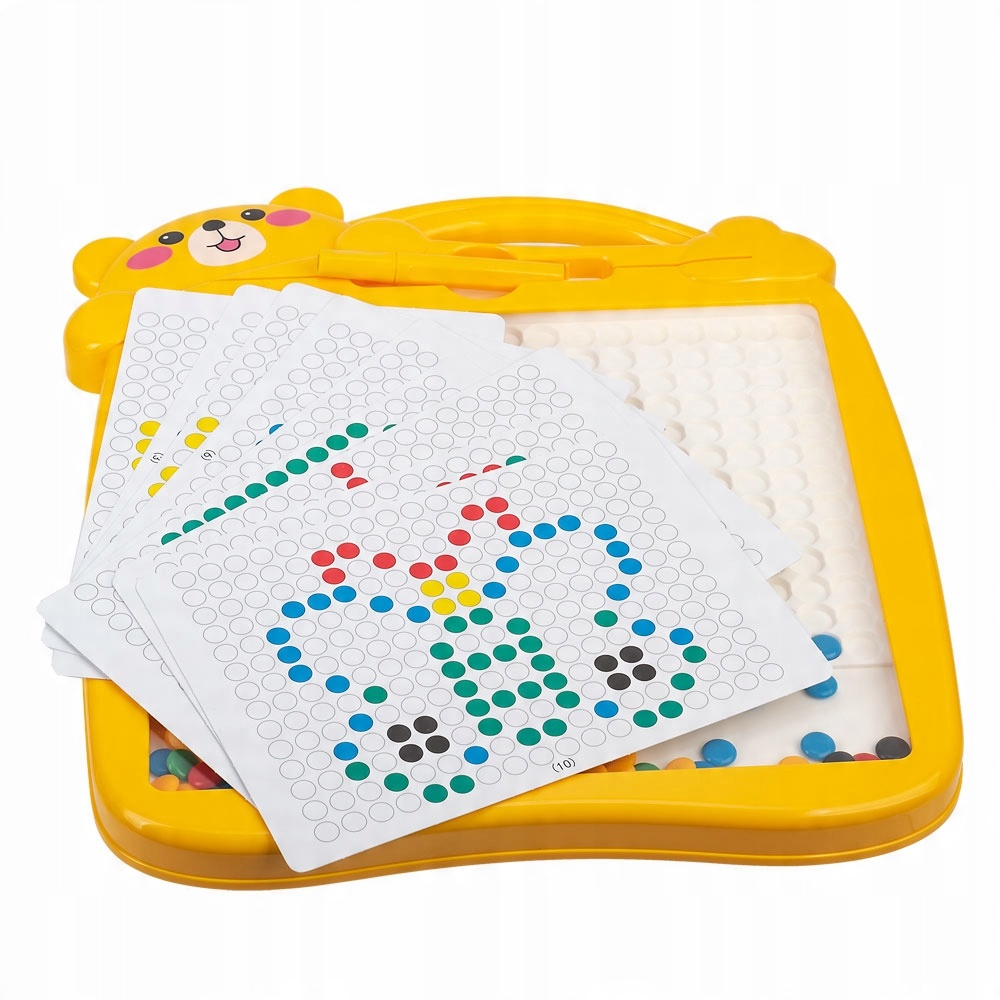 Magnetyczna układanka to kreatywny zestaw edukacyjny, który rozwija wyobraźnię i zdolności manualne dzieci, zapewniając im jednocześnie godziny zabawy i nauki. Tablica układanki została wykonana z wytrzymałego materiału, na którym umieszczono przezroczystą pleksę. Pod pleksą znajdują się liczne dołki, które tworzą siatkę, a w każdym z nich można umieścić kolorowe metalowe guziki.