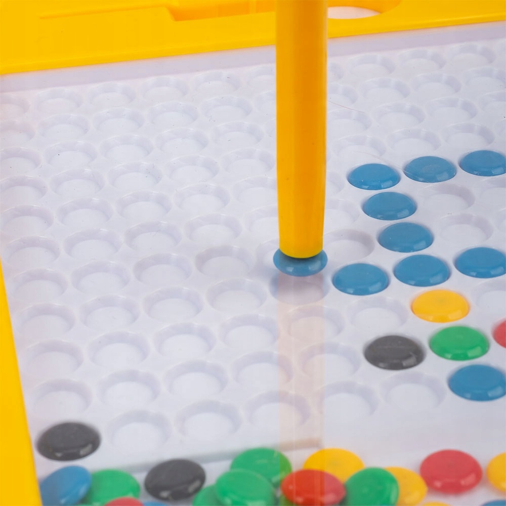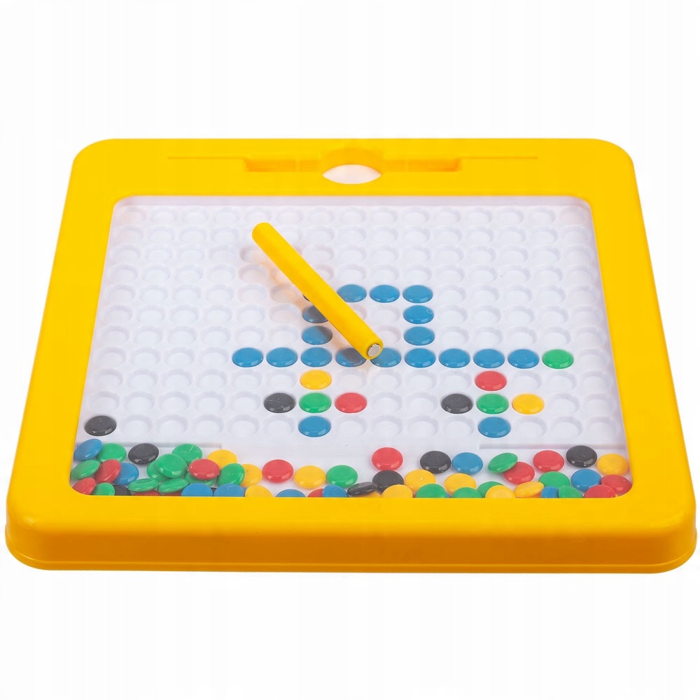 Magnetyczna układanka to kreatywny zestaw edukacyjny, który rozwija wyobraźnię i zdolności manualne dzieci, zapewniając im jednocześnie godziny zabawy i nauki. Tablica układanki została wykonana z wytrzymałego materiału, na którym umieszczono przezroczystą pleksę. Pod pleksą znajdują się liczne dołki, które tworzą siatkę, a w każdym z nich można umieścić kolorowe metalowe guziki.