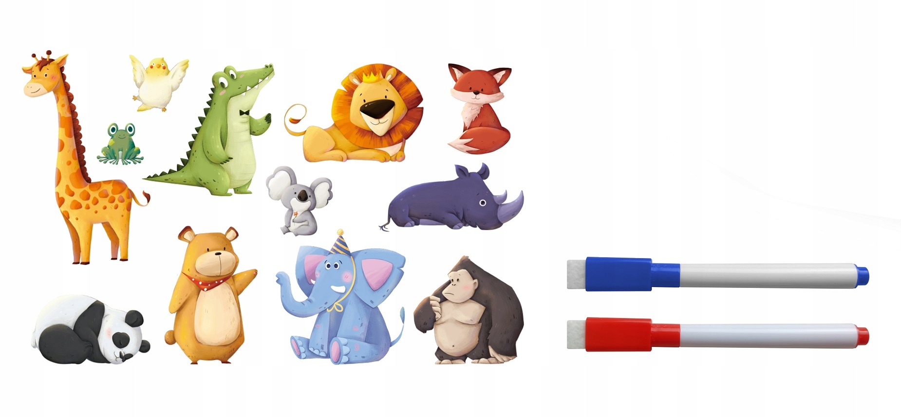 Zawartość zestawu: 41 elementów magnetycznych, 2 zmazywalne pisaki, biała tablica z magnetyczną podkładką na odwrocie