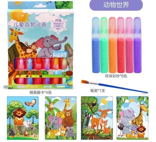 MALOWANIE PIASKIEM - DZIKIE ZWIERZĘTA KARTON, pak-126 W zestawie pędzelek,4 szablony-nakleki oraz 6 kolorowych pisaków z piaskiem do malowania
