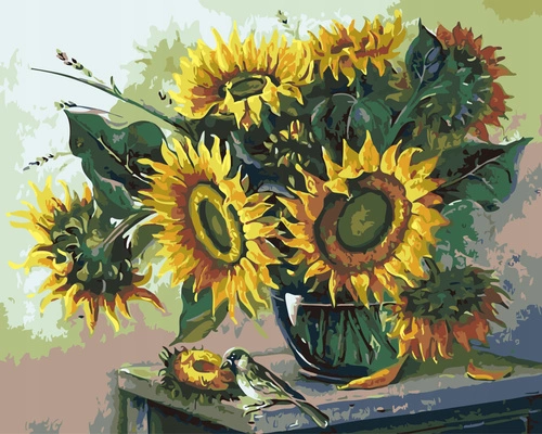Malowanie Po Numerach Bukiet Słoneczników I Wróblek Na Stoliku 50X40 Z Ramą