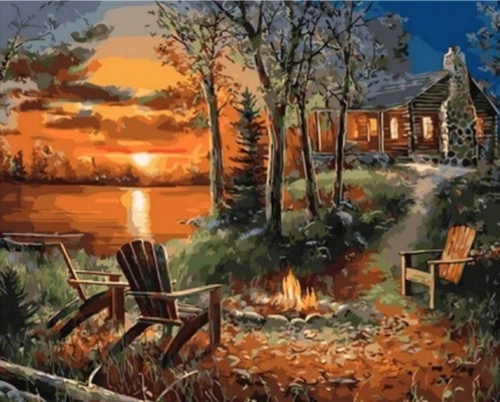 Malowanie Po Numerach Dom Z Ogniskiem Przy Zachodzie Słońca 40x50 Na Ramie