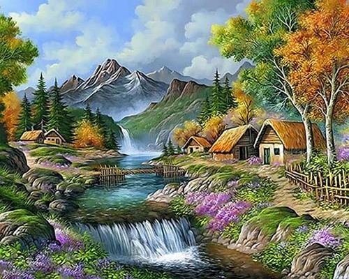 Malowanie Po Numerach Domki nad Górską Rzeką 40x50 Na Ramie