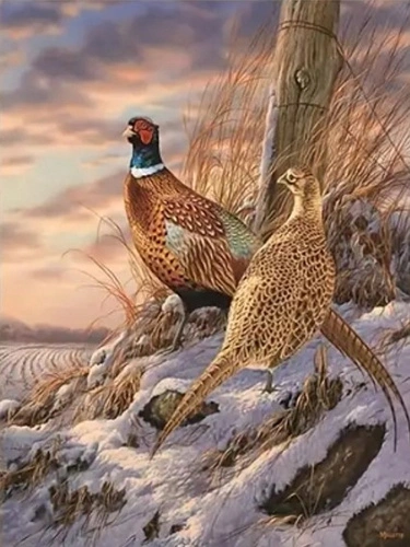 Malowanie Po Numerach Dwa Bażanty Na Polu Pokrytym Śniegiem 50x40 Z Ramą