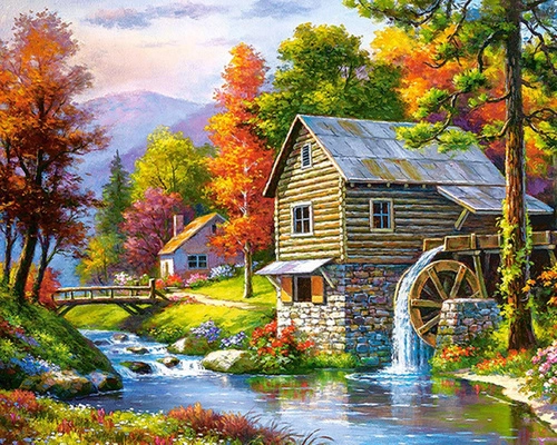 Malowanie Po Numerach Młyn Wodny Nad Rzeką Jesienią 40X50 Rama
