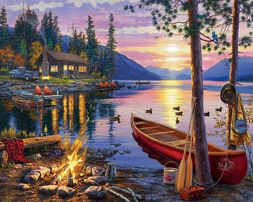 Malowanie Po Numerach Ognisko Obok Łódki 50X40 Cm Z Ramą Kreatywne