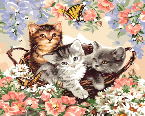 Malowanie Po Numerach Trzy Koty W Koszyczku Wśród Kwiatów 40X50 Cm Na Ramie