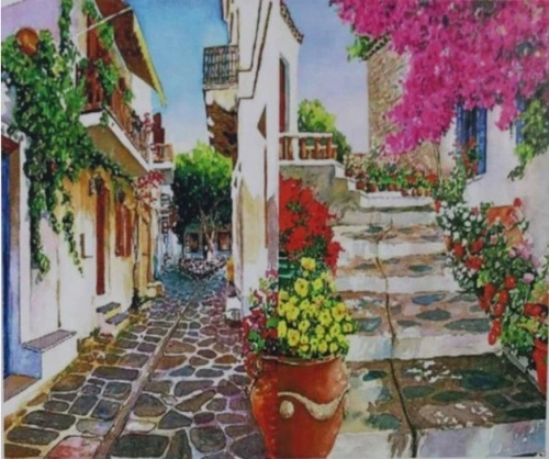 Malowanie Po Numerach Uliczka Brukowa Z Kwiatami