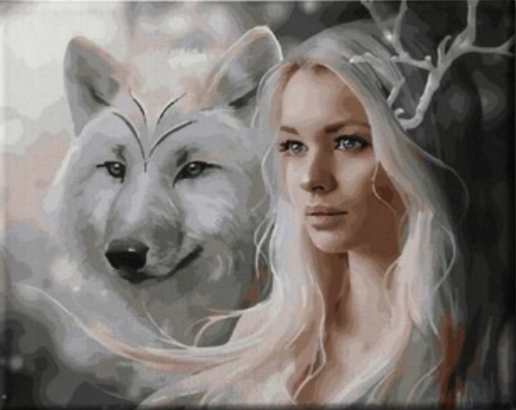 Malowanie Po Numerach Wilk Z Kobietą Biel 50X40 Cm Na Ramie Kreatywne